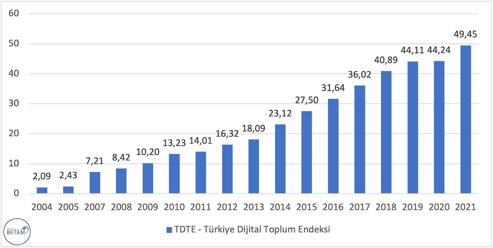 Türkiye Dijital Toplum Endeksi (TDTE) adını verdiğimiz bu endeks, Türkiye’deki hanehalklarının 2004-2021 arasında dijitalleşme yolunda ciddi bir mesafe kat ettiğini göstermektedir. 2004 yılından 2013 yılına kadar olan ilk on yıllık süreçte dijitalleşmedeki ivmenin, 2014 yılı itibariyle daha da hızlanarak 2019 yılına değin devam ettiği görülmektedir. 2020 yılındaki duraklamanın ardından ise Covid19 salgını sürecinde tekrar artışa geçtiği dikkat çekmektedir.